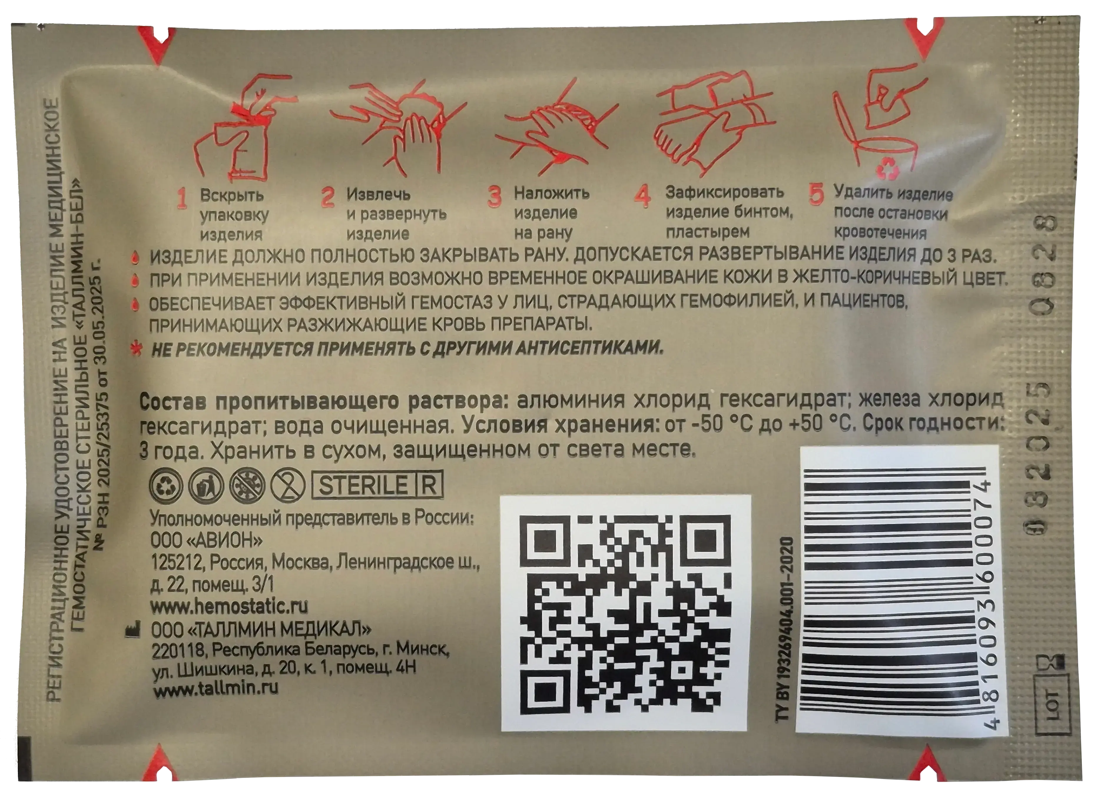 ГЕМОСТАТИК “ТАЛЛМИН-БЕЛ” является местным кровоостанавливающим средством, представляющим собой изделие из текстильных материалов, пропитанных специальным гемостатическим раствором, разработанным специалистами ООО “ТАЛЛМИН МЕДИКАЛ”, Республика Беларусь.